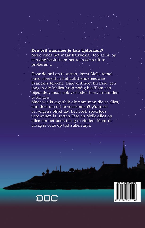 Door de bril op te zetten, komt Melle totaal onvoorbereid in het achttiende-eeuwse Franeker terecht. Daar ontmoet hij Eise, een jongen die Melles hulp nodig heeft om een bijzonder, maar ook verboden boek in handen te krijgen.