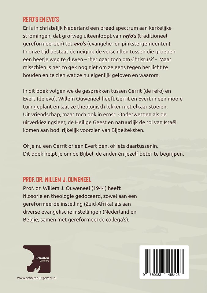 In dit boek volgen we de gesprekken tussen Gerrit (de refo) en Evert (de evo). Willem Ouweneel heeft Gerrit en Evert in een mooie tuin geplant en laat ze theologisch lekker met elkaar stoeien. Uit vriendschap, maar toch ook in ernst. Onderwerpen als de uitverkiezingsleer, de Heilige Geest en natuurlijk de rol van Israël komen aan bod, rijkelijk voorzien van Bijbelteksten.