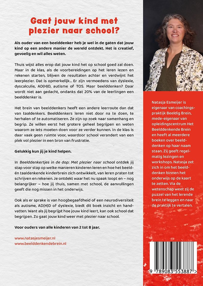 In Beelddenkertjes in de dop: Met plezier naar school ontdek jij stap voor stap op welke manieren kinderen leren en hoe het beeld- én taaldenkende kinderbrein zich ontwikkelt, van leren praten tot schrijven en rekenen. Je ontdekt waar het nu spaak loopt en – nog belangrijker – hoe jij thuis, samen met school, de aanvullingen geeft die nog missen in het onderwijs.