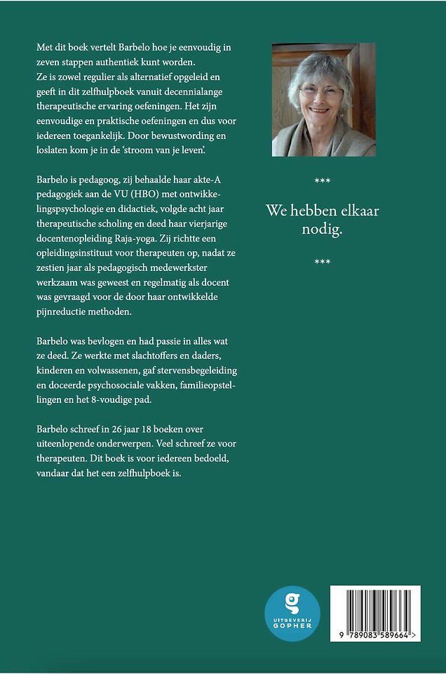 Met dit boek vertelt Barbelo hoe je eenvoudig in zeven stappen authentiek kunt worden. Ze is zowel regulier als alternatief opgeleid en geeft in dit zelfhulpboek vanuit decennialange therapeutische ervaring oefeningen. Het zijn eenvoudige en praktische oefeningen en dus voor iedereen toegankelijk. Door bewustwording en loslaten kom je in de ‘stroom van je leven’.