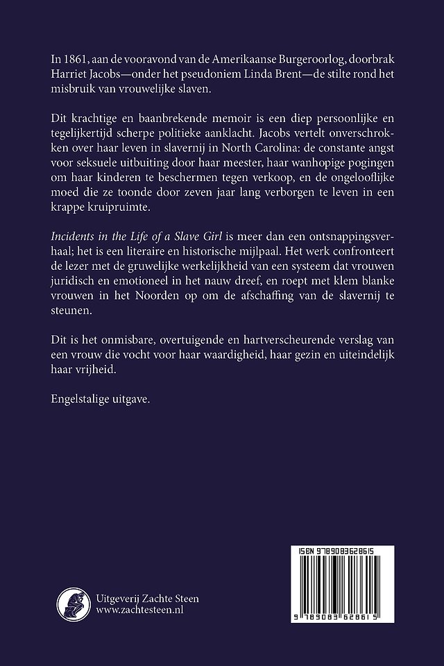Dit krachtige en baanbrekende memoir is een diep persoonlijke en tegelijkertijd scherpe politieke aanklacht. Jacobs vertelt onverschrokken over haar leven in slavernij in North Carolina: de constante angst voor seksuele uitbuiting door haar meester, haar wanhopige pogingen om haar kinderen te beschermen tegen verkoop, en de ongelooflijke moed die ze toonde door zeven jaar lang verborgen te leven in een krappe kruipruimte.