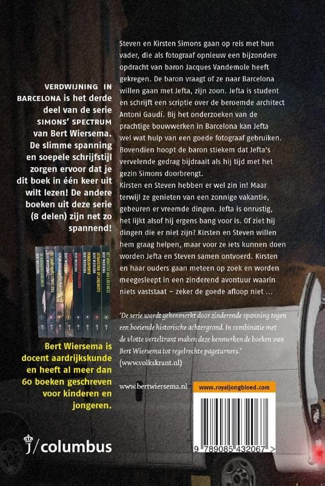 Verdwijning in Barcelona is het derde deel van de serie Simons Spectrum van Bert Wiersema. De serie wordt gekenmerkt door zinderende spanning tegen een boeiende historische achtergrond. In combinatie met de vlotte verteltrant maken deze kenmerken de boeken van Bert Wiersema tot regelrechte pageturners.