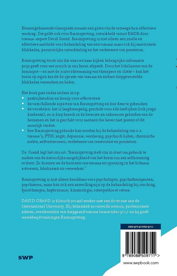 “David Grand is één van de belangrijkste en meest effectieve traumatherapeuten die momenteel praktiseren. Zijn ontwikkeling van Brainspotting is een grote stap voorwaarts in het mensen helpen omgaan met hun trauma. Brainspotting is een opmerkelijke, geavanceerde, flexibele aanvulling in het therapeutisch arsenaal van elke psychotherapeut. Ik weet het omdat ik het regelmatig gebruik en de resultaten zijn, in combinatie met mijn gebruikelijke psychoanalytische aanpak, verbazingwekkend helpend. Wanneer men het gebruikt, raakt men verwonderd over de mate waarin trauma zich toont in onze dagelijkse reflexen van aangezicht en ogen en over hoe snel veel trauma’s en symptomen kunnen verminderen door het gebruik van deze vensters op onze innerlijke mentale toestanden. Grand schrijft helder en, al zijn de casussen dramatisch, ze worden niet overdreven.”