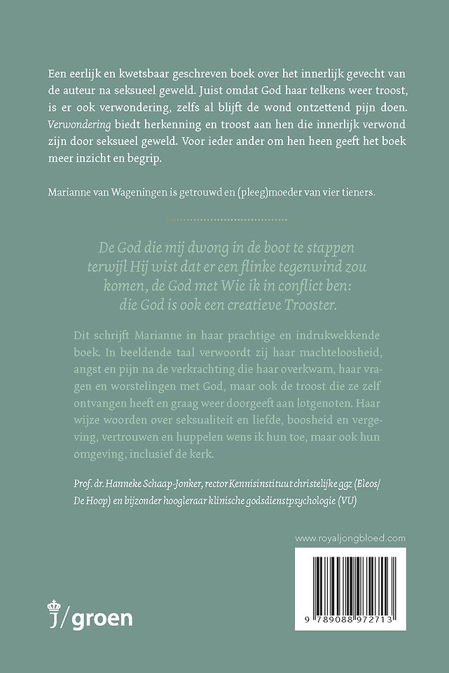 ‘De God die mij dwong in de boot te stappen terwijl Hij wist dat er een flinke tegenwind zou komen, de God met wie ik in conflict ben, die God is ook een creatieve Trooster’, schrijft Marianne in dit prachtige en indrukwekkende boek. In beeldende taal verwoordt zij haar machteloosheid, angst en pijn na de verkrachting die haar overkwam, haar vragen en worstelingen met God, maar ook de troost die ze zelf ontvangen heeft en graag weer doorgeeft aan lotgenoten. Haar wijze woorden over seksualiteit en liefde, boosheid en vergeving, vertrouwen en huppelen wens ik hen toe, maar ook hun omgeving, inclusief de kerk!