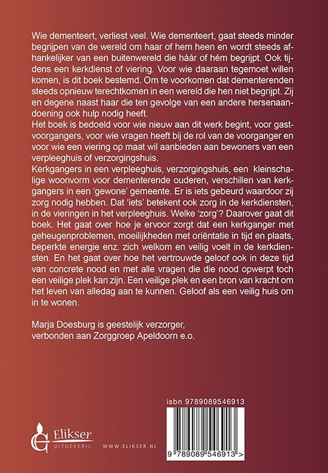 Wie dementeert, verliest veel. Wie dementeert, gaat steeds minder begrijpen van de wereld om haar of hem heen en wordt steeds afhankelijker van een buitenwereld die háár of hém begrijpt. Ook tijdens een kerkdienst of viering. Voor wie daaraan tegemoet willen komen, is dit boek bestemd. Om te voorkomen dat dementerenden steeds opnieuw terechtkomen in een wereld die hen niet begrijpt. Zij en degene naast haar die ten gevolge van een andere hersenaandoening ook hulp nodig heeft.