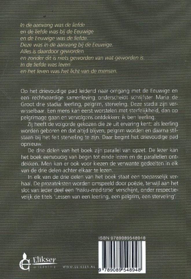 Op het drievoudige pad leidend naar omgang met de Eeuwige en een rechtvaardige samenleving onderscheidt schrijfster Maria de Groot drie stadia: leerling, pelgrim, sterveling. Deze stadia zijn verwisselbaar. Een mens kan eerst worstelen met sterfelijkheid, dan op pelgrimage gaan en vervolgens ontdekken: ik ben leerling.
