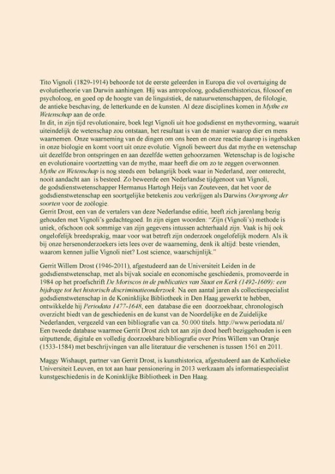 Tito Vignoli (1829-1914) behoorde tot de eerste geleerden in Europa die vol overtuiging de evolutietheorie van Darwin aanhingen. Hij was antropoloog, godsdiensthistoricus, filosoof en psycholoog, en goed op de hoogte van de linguïstiek, de natuurwetenschappen, de filologie, de antieke beschaving, de letterkunde en de kunsten. Al deze disciplines komen in Mythe en wetenschap aan de orde.