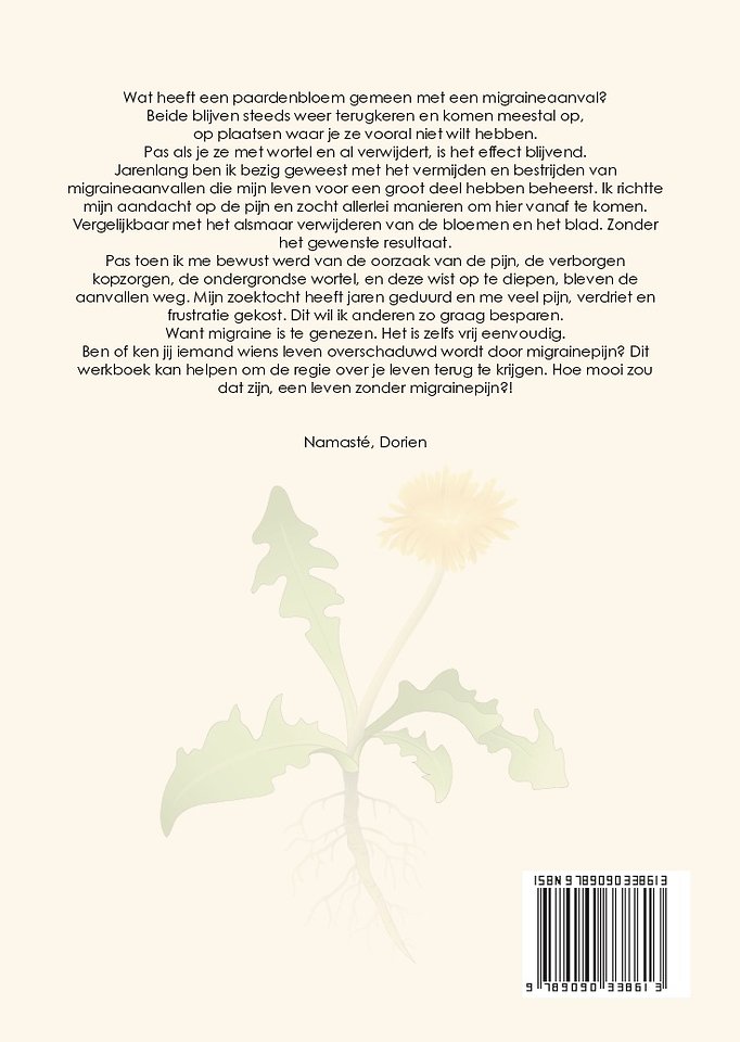 Pas toen ik me bewust werd van de oorzaak van de pijn, de verborgen kopzorgen, de ondergrondse wortel, en deze wist op te diepen, bleven de aanvallen weg. Mijn zoektocht heeft jaren geduurd en me veel pijn, verdriet en frustratie gekost. Dit wil ik anderen zo graag besparen. Want migraine is te genezen. Het is zelfs vrij eenvoudig. Ben of ken jij iemand wiens leven overschaduwd wordt door migrainepijn? Dit werkboek kan helpen om de regie over je leven terug te krijgen. Hoe mooi zou dat zijn, een leven zonder migrainepijn?!