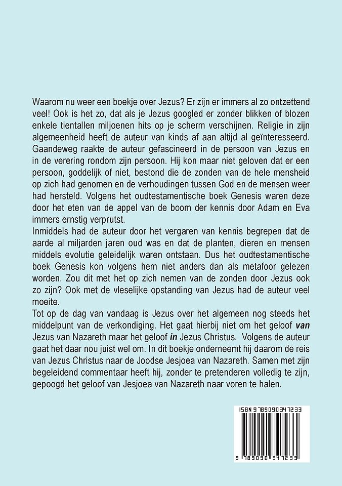 Waarom nu weer een boekje over Jezus? Er zijn er immers al zo ontzettend veel! Ook is het zo, dat als je Jezus googled er zonder blikken of blozen enkele tientallen miljoenen hits op je scherm verschijnen. Religie in zijn algemeenheid heeft de auteur van kinds af aan altijd al geïnteresseerd. Gaandeweg raakte de auteur gefascineerd in de persoon van Jezus en in de verering rondom zijn persoon. Hij kon maar niet geloven dat er een persoon, goddelijk of niet, bestond die de zonden van de hele mensheid op zich had genomen en de verhoudingen tussen God en de mensen weer had hersteld. Volgens het oudtestamentische boek Genesis waren deze door het eten van de appel van de boom der kennis door Adam en Eva immers ernstig verprutst.