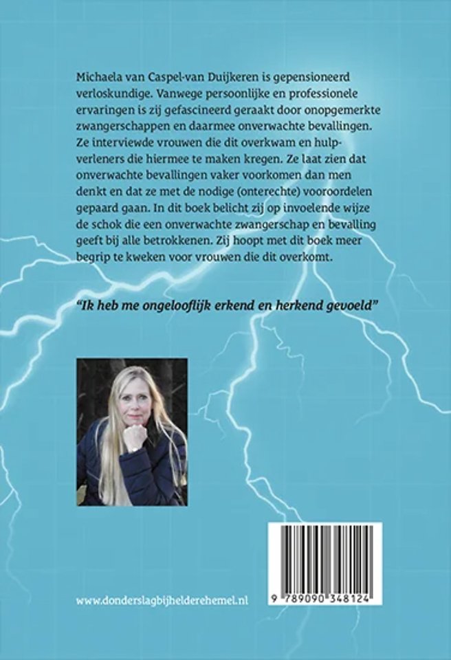 In Donderslag bij heldere hemel lees je de verhalen van vrouwen die bevielen zonder dat ze wisten dat ze zwanger waren. Hoewel het al zo oud is als de wereld en het vaker voorkomt dan men denkt, gaat het niet opmerken van een zwangerschap nog altijd gepaard met vooroordelen. Hoe kan dit gebeuren, hebben zulke vrouwen dan helemaal niets van hun zwangerschap in de gaten? Worden ze niet dikker, voelen ze geen baby bewegen in hun buik en stoppen ze niet met menstrueren?