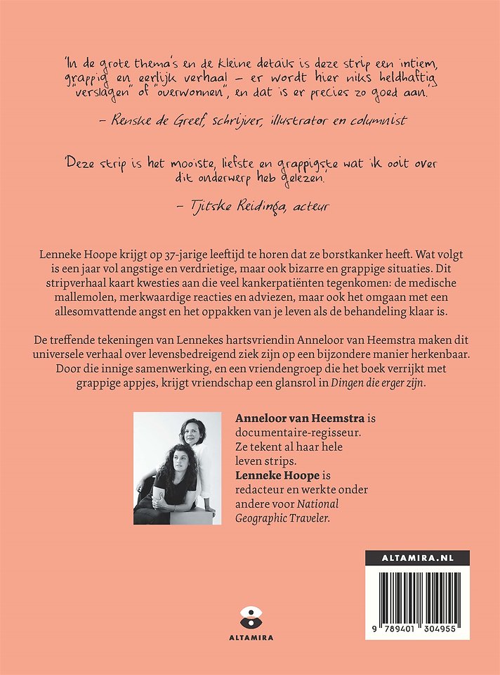In het stripverhaal 'Dingen die erger zijn' lees je over Lennekes ervaringen als borstkankerpatiënt: de chemo's in het ziekenhuis, de merkwaardige reacties en adviezen uit haar omgeving, het ziek en uitgeblust op de bank liggen en het omgaan met een constante en allesomvattende angst.