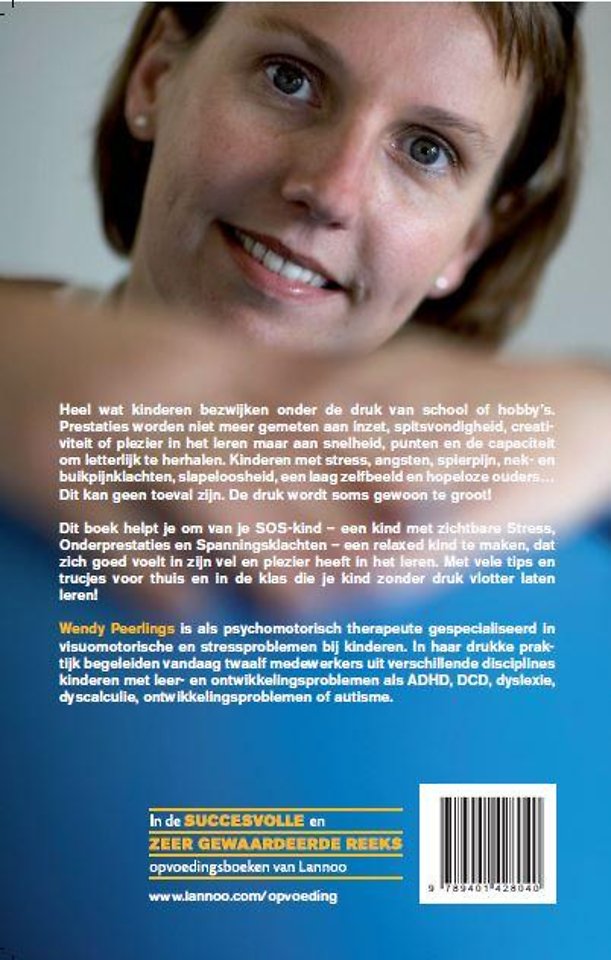 Heel wat kinderen bezwijken onder de druk van school of hobby's. Prestaties worden niet meer gemeten aan inzet, spitsvondigheid, creativiteit of plezier in het leren maar aan snelheid, punten en de capaciteit om letterlijk te herhalen. Kinderen met stress, angsten, spierpijn, nek- en buikpijnklachten, slapeloosheid, een laag zelfbeeld en hopeloze ouders... Dit kan geen toeval zijn. De druk wordt soms gewoon te groot! Dit boek helpt je om van je SOS-kind - een kind met zichtbare Stress, Onderprestaties en Spanningsklachten - een relaxed kind te maken, dat zich goed voelt in zijn vel en plezier heeft in het leren. Met vele tips en trucjes voor thuis en in de klas die je kind zonder druk vlotter laten leren!