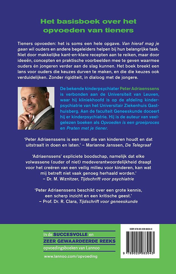 Tieners opvoeden: het is soms een hele opgave. Van hieraf mag je gaan wil ouders en andere begeleiders helpen bij hun belangrijke taak. Niet door makkelijke kant-en-klare recepten aan te reiken, maar door ideeën, concepten en praktische voorbeelden mee te geven waarmee ouders én jongeren verder aan de slag kunnen. Het boek breekt een lans voor ouders die keuzes durven te maken, en die die keuzes ook verduidelijken. Zonder rigiditeit, in dialoog met de jongere.