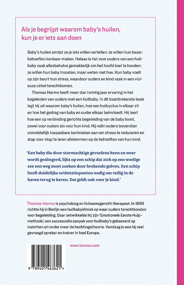 Thomas Harms heeft meer dan twintig jaar ervaring in het begeleiden van ouders met een huilbaby. In dit baanbrekende boek legt hij uit waarom baby's huilen, hoe een huilcyclus in elkaar zit en hoe het gedrag van baby en ouder elkaar beïnvloedt. Hij leert hoe een op verbinding gerichte begeleiding van de baby loont, zowel voor ouders als voor hun kind. Hij reikt ouders bovendien onmiddellijk toepasbare technieken aan om stress te reduceren en stap voor stap te leren afstemmen op de behoeften van hun kind.