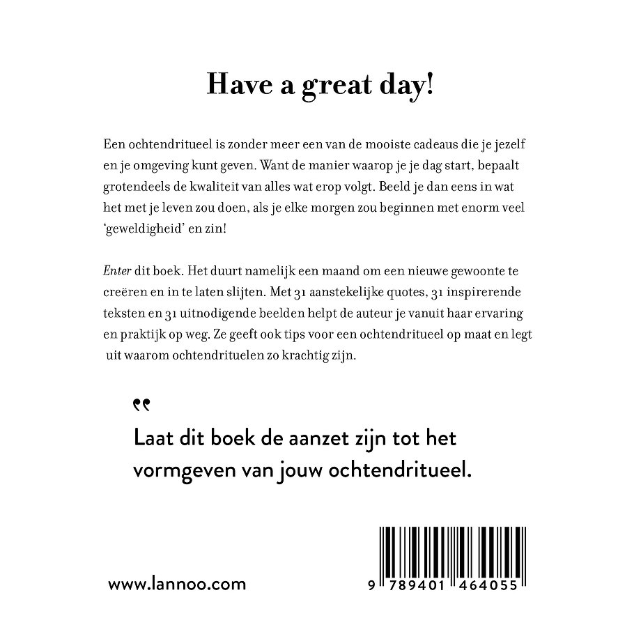 Enter dit boek. Het duurt namelijk een maand om een nieuwe gewoonte te creëren en in te laten slijten. Met 31 aanstekelijke quotes, 31 inspirerende teksten en 31 uitnodigende beelden, helpt de auteur je vanuit haar ervaring en praktijk op weg. Ze geeft ook tips voor een ochtendritueel op maat en legt uit waarom ochtendrituelen zo krachtig zijn.