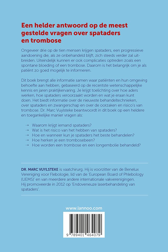 Dit boek brengt alle informatie samen waar patiënten en hun omgeving behoefte aan hebben, gebaseerd op de recentste wetenschappelijke kennis en jaren praktijkervaring. Je krijgt toelichting over hoe aders werken, hoe spataders veroorzaakt worden en wat je eraan kunt doen. Het biedt informatie over de nieuwste behandeltechnieken, over spataders en zwangerschap en over de oorzaken en risico's van trombose. Dr. Marc Vuylsteke beantwoordt in dit boek op een heldere en toegankelijke manier vragen als: Waarom krijgt iemand spataders? Wat is het risico van het hebben van spataders? Hoe en wanneer kun je spataders het beste behandelen? Hoe herken je een trombosebeen? Hoe worden een trombose en een longembolie behandeld?