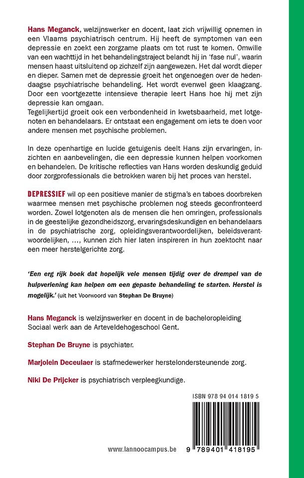 In deze openhartige en lucide getuigenis deelt Hans zijn ervaringen, inzichten en aanbevelingen, die een depressie kunnen helpen voorkomen en behandelen. De kritische reflecties van Hans worden deskundig geduid door zorgprofessionals die betrokken waren bij het proces van herstel. Depressief wil op een positieve manier de stigma's en taboes doorbreken waarmee mensen met psychische problemen nog steeds geconfronteerd worden. Zowel lotgenoten als de mensen die hen omringen, professionals in de geestelijke gezondheidszorg, ervaringsdeskundigen en behandelaars in de psychiatrische zorg, opleidingsverantwoordelijken, beleidsverantwoordelijken, ..., kunnen zich hier laten inspireren in hun zoektocht naar een meer herstelgerichte zorg.