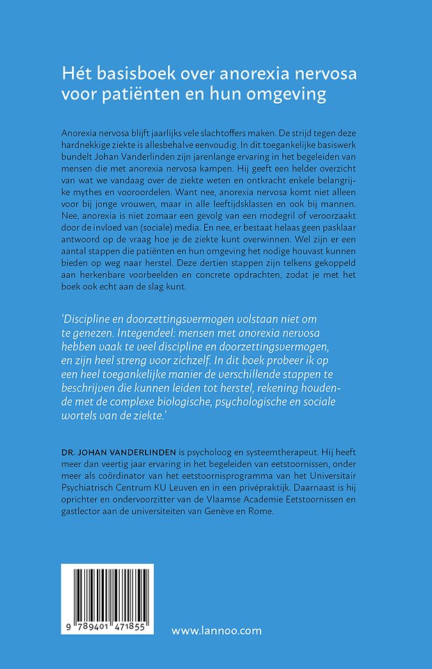 Anorexia nervosa blijft jaarlijks vele slachtoffers maken. De strijd tegen deze hardnekkige ziekte is allesbehalve eenvoudig. In dit toegankelijke basiswerk bundelt Johan Vanderlinden zijn jarenlange ervaring in het begeleiden van mensen die met anorexia nervosa kampen. Hij geeft een helder overzicht van wat we vandaag over de ziekte weten en ontkracht enkele belangrijke mythes en vooroordelen. Want nee, anorexia nervosa komt niet alleen voor bij jonge vrouwen, maar in alle leeftijdsklassen en ook bij mannen. Nee, anorexia is niet zomaar een gevolg van een modegril of veroorzaakt door de invloed van (sociale) media. En nee, er bestaat helaas geen pasklaar antwoord op de vraag hoe je de ziekte kunt overwinnen. Wel zijn er een aantal stappen die patiënten en hun omgeving het nodige houvast kunnen bieden op weg naar herstel. Deze dertien stappen zijn telkens gekoppeld aan herkenbare voorbeelden en concrete opdrachten, zodat je met het boek ook echt aan de slag kunt.