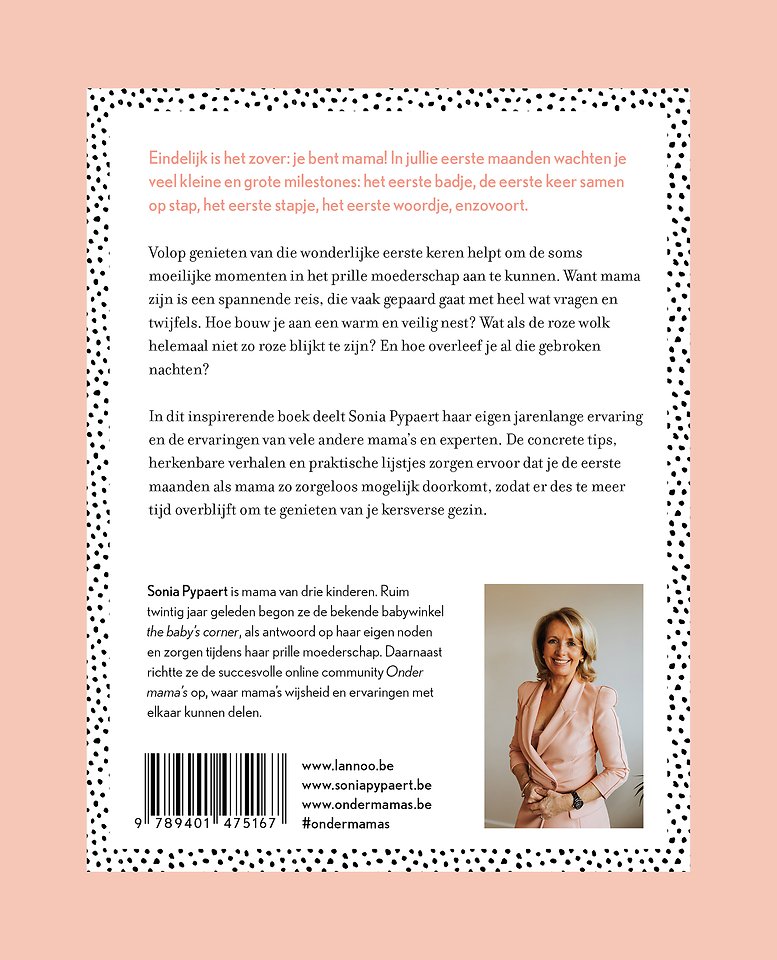 In dit inspirerende boek deelt Sonia Pypaert haar eigen jarenlange ervaring en de ervaringen van vele andere mama's en experten. De concrete tips, herkenbare verhalen en praktische lijstjes zorgen ervoor dat je de eerste maanden als mama zo zorgeloos mogelijk doorkomt, zodat er des te meer tijd overblijft om te genieten van je kersverse gezin.