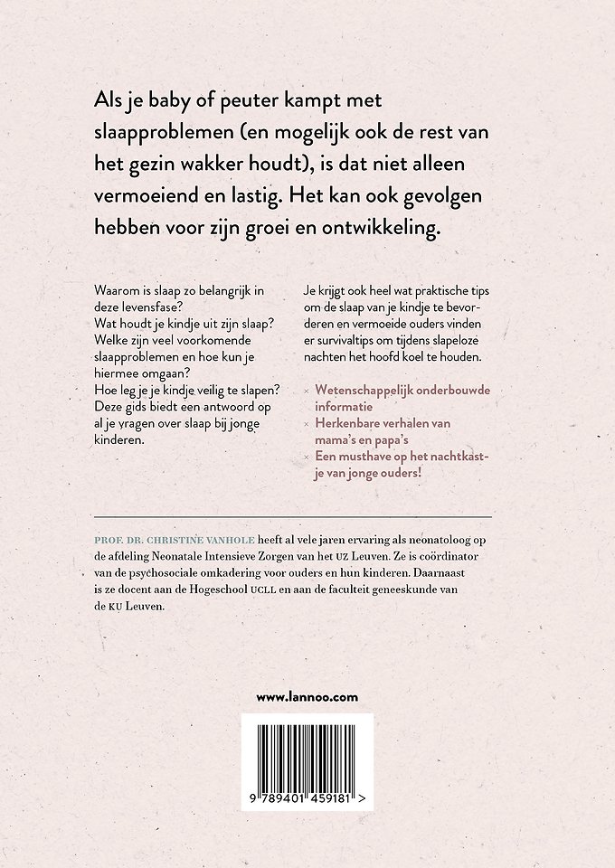 Waarom is slaap zo belangrijk in deze levensfase? Wat houdt je kindje uit zijn slaap? Welke zijn veel voorkomende slaapproblemen en hoe kun je hiermee omgaan? Hoe leg je je kindje veilig te slapen? Deze gids biedt een antwoord op al je vragen over slaap bij jonge kinderen. Je krijgt ook heel wat praktische tips om de slaap van je kindje te bevorderen en vermoeide ouders vinden er survivaltips om tijdens slapeloze nachten het hoofd koel te houden. Wetenschappelijk onderbouwde informatie Herkenbare verhalen van mama's en papa's Een musthave op het nachtkastje van jonge ouders!