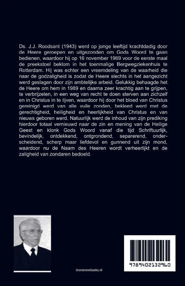 Ds. J.J. Roodsant (1943) werd op jonge leeftijd krachtdadig door de Heere geroepen en uitgezonden om Gods Woord te gaan bedienen, waardoor hij op 16 november 1969 voor de eerste maal de preekstoel beklom in het toenmalige Bergwegziekenhuis te Rotterdam. Hij was echter een vreemdeling van de waarheid die naar de godzaligheid is zodat de Heere slechts in het aangezicht werd geslagen door zijn ambtelijke arbeid. Gelukkig behaagde het de Heere om hem in 1989 en daarna zeer krachtig aan te grijpen, te verbrijzelen, in een weg van recht te doen sterven aan zichzelf en in Christus in te lijven, waardoor hij door het bloed van Christus gereinigd werd van alle vuile zonden, bekleed werd met de gerechtigheid, heiligheid en heerlijkheid van Christus en van nieuws geboren werd. Natuurlijk werd de inhoud van zijn prediking hierdoor totaal vernieuwd naar de zin en mening van de Heilige Geest en klonk Gods Woord vanaf die tijd Schriftuurlijk, bevindelijk, ontdekkend, ontgrondend, separerend, onder-scheidend, scherp maar liefdevol en gunnend uit zijn mond, waardoor nu de Naam des Heeren wordt verheerlijkt en de zaligheid van zondaren bedoeld.