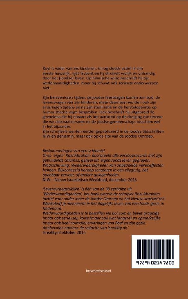 Roel is vader van zes kinderen, is nog steeds actief in zijn éérste huwelijk, rijdt Trabant en hij struikelt vrolijk en onhandig door het (joodse) leven. Op hilarische wijze beschrijft hij zijn wederwaardigheden, maar hij schuwt ook serieuze onderwerpen niet.