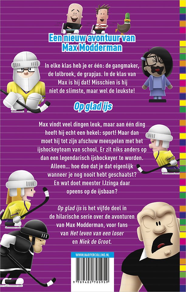 In elke klas heb je er één: de gangmaker, de lolbroek, de grappenmaker. En in Max’ klas is híj dat! Hij is misschien niet de slimste, maar wel de grappigste! Max vindt veel dingen leuk, maar aan één ding heeft hij echt een hekel: sport! En nu moet hij tot zijn afgrijzen meespelen met het ijshockeyteam. Er is toch niks leuks aan uitglijden en een bevroren kont krijgen? Max heeft altijd een lach op zijn gezicht, maar nu begeeft hij zich op glad ijs!