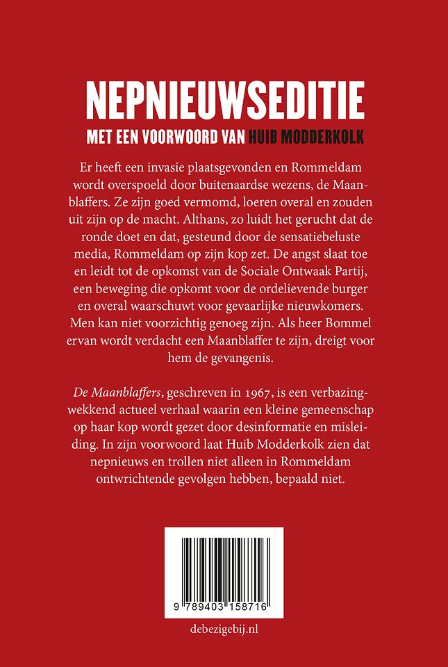 De Maanblaffers, geschreven in 1967, is een verbazingwekkend actueel verhaal waarin een kleine gemeenschap op haar kop wordt gezet door desinformatie en misleiding. In zijn voorwoord laat Huib Modderkolk zien dat nepnieuws en trollen niet alleen in Rommeldam ontwrichtende gevolgen hebben, bepaald niet.