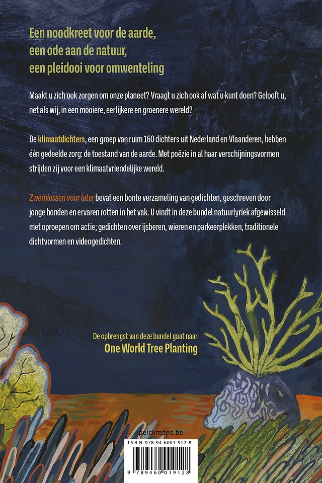 'Zwemlessen voor later' bevat een bonte verzameling van gedichten, geschreven door jonge honden en ervaren rotten in het vak. U vindt in deze bundel natuurlyriek, afgewisseld met oproepen over ijsberen, wieren en parkeerplekken, traditionele dichtvormen en videogedichten.