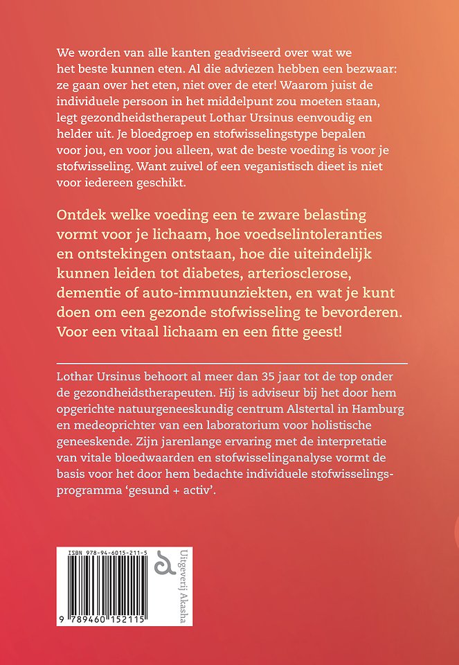We worden van alle kanten geadviseerd over wat we het beste kunnen eten. Al die adviezen hebben een bezwaar: ze gaan over het eten, niet over de eter! Waarom juist de individuele persoon in het middelpunt zou moeten staan, legt gezondheidstherapeut Lothar Ursinus eenvoudig en helder uit. Je bloedgroep en stofwisselingstype bepalen voor jou, en voor jou alleen, wat de beste voeding is voor je stofwisseling. Want zuivel of een veganistisch dieet is niet voor iedereen geschikt.