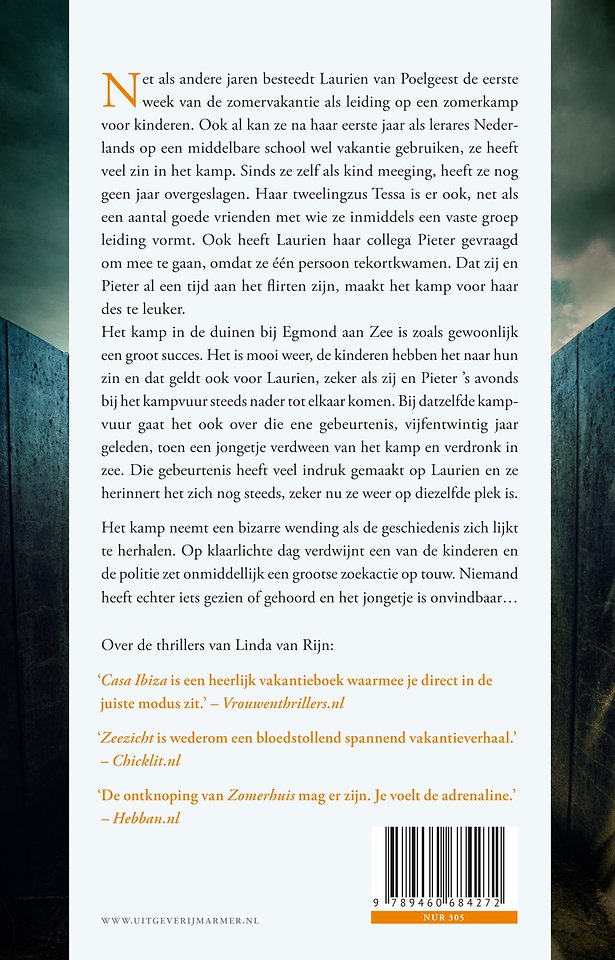 Het kamp in de duinen bij Egmond aan Zee is zoals gewoonlijk een groot succes. Het is mooi weer, de kinderen hebben het naar hun zin en dat geldt ook voor Laurien, zeker als zij en Pieter ’s avonds bij het kampvuur steeds nader tot elkaar komen. Bij datzelfde kampvuur gaat het ook over die ene gebeurtenis, vijfentwintig jaar geleden, toen een kind verdween van het kamp en verdronk in zee. Die gebeurtenis heeft veel indruk gemaakt op Laurien en ze herinnert het zich nog steeds, zeker nu ze weer op diezelfde plek is.