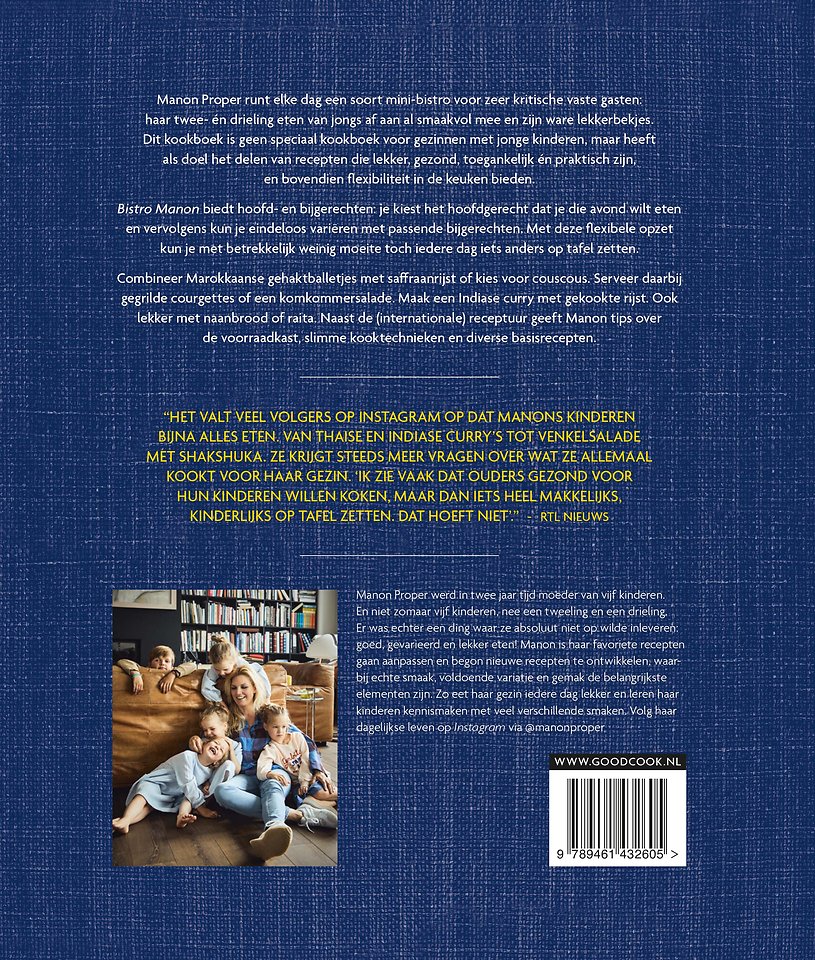 Manon Proper runt elke dag een soort mini-bistro voor zeer kritische vaste gasten: haar twee- én drieling eten van jongs af aan al smaakvol mee en zijn ware lekkerbekjes. Dit kookboek is geen speciaal kookboek voor gezinnen met jonge kinderen, maar heeft als doel het delen van recepten die lekker, gezond, toegankelijk én praktisch zijn, en bovendien flexibiliteit in de keuken bieden.