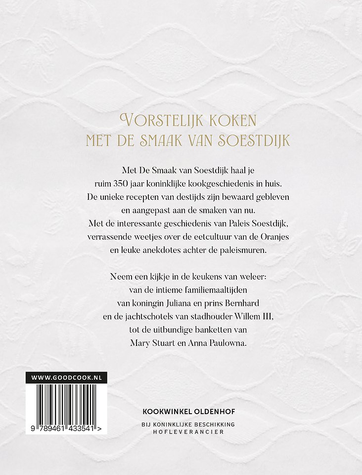 Met De Smaak van Soestdijk haal je ruim 350 jaar koninklijke kookgeschiedenis in huis. De unieke recepten van destijds zijn bewaard gebleven en aangepast aan de smaken van nu. Met de interessante geschiedenis van Paleis Soestdijk, verrassende weetjes over de eetcultuur van de Oranjes en leuke anekdotes achter de paleismuren.