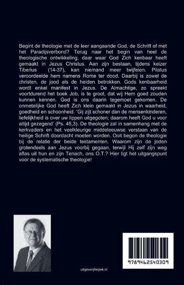Begint de theologie met de leer aangaande God, de Schrift of met het Paradijsverbond? Terug naar het begin van heel de theologische ontwikkeling, daar waar God Zich kenbaar heeft gemaakt in Jezus Christus. Aan zijn bestaan, tijdens keizer Tiberius (14-37), kan niemand meer twijfelen. Pilatus veroordeelde hem namens Rome ter dood. Daarbij is zowel de christen, de jood als de heiden betrokken. Gods kenbaarheid wordt enkel manifest in Jezus. De Almachtige, zo spreekt voortdurend het boek Job, is te groot, dat wij Hem goed zouden kunnen kennen. God is ons daarin tegemoet gekomen. De onmetelijke God heeft Zich klein gemaakt in Jezus in waarheid, goedheid en schoonheid. ‘Gij zijt schoner dan de mensenkinderen, liefelijkheid is over uw lippen uitgegoten; daarom heeft God u voor altijd gezegend’ (Ps. 45,3). De theologie zal in samenhang met de kerkvaders en het veelkleurige middeleeuwse verstaan van de heilige Schrift doordacht moeten worden. Ooit begon de theologie bij de relatie der beide testamenten. Waarom zijn de joden grotendeels aan Jezus voorbij gegaan, terwijl Hij zelf zijn weg aflas uit hun en zijn Tenach, ons O.T.? Hier ligt het uitgangspunt voor de systematische theologie!
