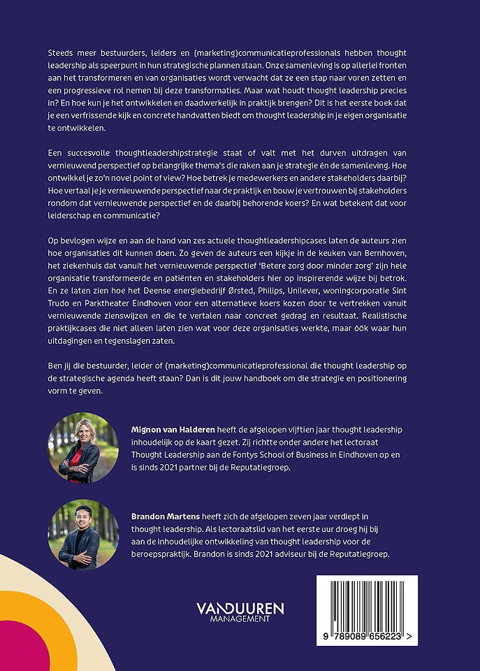 Steeds meer bestuurders, leiders en (marketing)communicatieprofessionals hebben thought leadership als speerpunt in hun strategische plannen staan. Onze samenleving is op allerlei fronten aan het transformeren en van organisaties wordt verwacht dat ze een stap naar voren zetten en een progressieve rol nemen bij deze transformaties. Maar wat houdt thought leadership precies in? En hoe kun je het ontwikkelen en daadwerkelijk in praktijk brengen? Dit is het eerste boek dat je een verfrissende kijk en concrete handvatten biedt om thought leadership in je eigen organisatie te ontwikkelen.