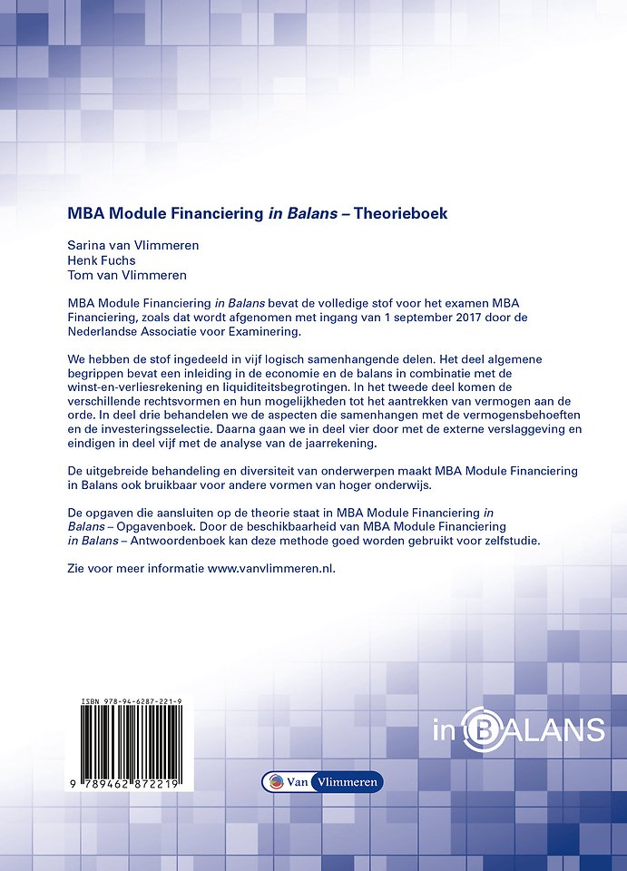 MBA Module Financiering in Balans bevat de volledige stof voor het examen MBA Financiering, zoals dat wordt afgenomen met ingang van 1 september 2017 door de Nederlandse Associatie voor Examinering.