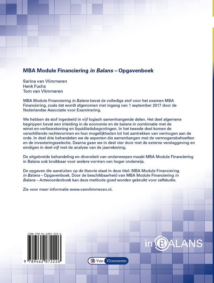 De opgaven die aansluiten op de theorie staan in deze titel: MBA Module Financiering in Balans – Opgavenboek. Door de beschikbaarheid van MBA Module Financiering in Balans – Antwoordenboek kan deze methode goed worden gebruikt voor zelfstudie.