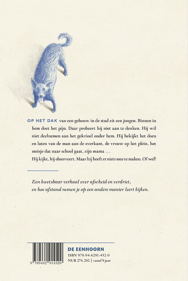Op het dak van een gebouw in de stad zit een jongen. Binnen in hem doet het pijn. Daar probeert hij niet aan te denken. Hij wil niet deelnemen aan het gekrioel onder hem. Hij bekijkt het doen en laten van de man aan de overkant, de vrouw op het plein, het meisje dat naar school gaat, zijn mama ... Hij kijkt, hij observeert. Maar hij heeft er niets mee te maken. Of toch?