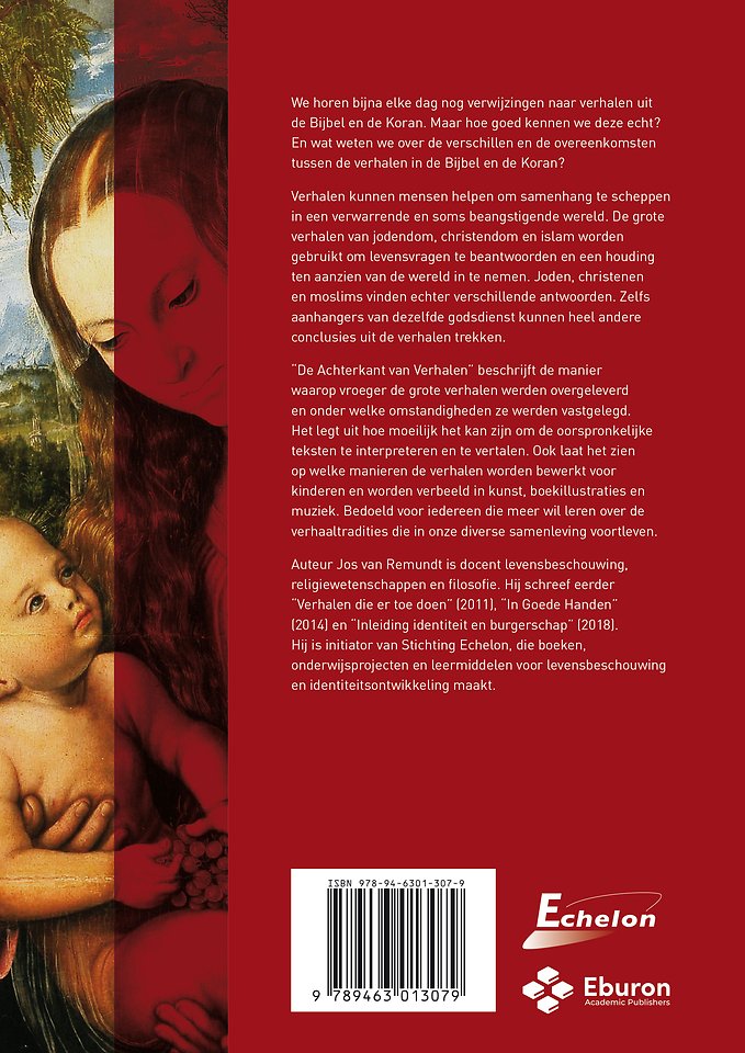 “De Achterkant van Verhalen” beschrijft de manier waarop vroeger de grote verhalen werden overgeleverd en onder welke omstandigheden ze werden vastgelegd. Het legt uit hoe moeilijk het kan zijn om de oorspronkelijke teksten te interpreteren en te vertalen. Ook laat het zien op welke manieren de verhalen worden bewerkt voor kinderen en worden verbeeld in kunst, boekillustraties en muziek. Bedoeld voor iedereen die meer wil leren over de verhaaltradities die in onze diverse samenleving voortleven.