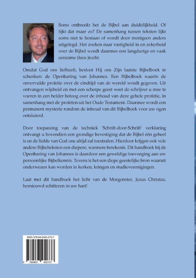 Omdat God ons liefheeft, besloot Hij ons Zijn laatste Bijbelboek te schenken: de Openbaring van Johannes. Een Bijbelboek waarin de onvervulde profetie over de eindtijd van de wereld wordt gegeven. Uit ontvangen wijsheid en met een scherpe geest weet de schrijver u mee te voeren in een helder betoog over de inhoud van deze gehele profetie, in samenhang met de profeten uit het Oude Testament. Daarmee wordt een permanent mysterie rondom de inhoud van dit Bijbelboek voor uw ogen ontsluierd.