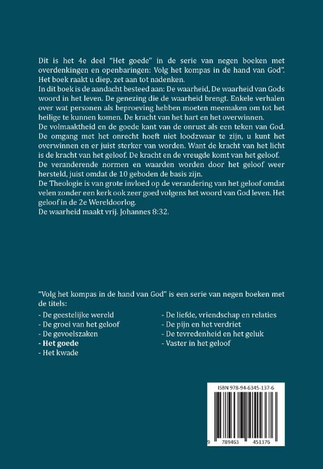 Dit is het 4e deel "Het goede" in de serie van negen boeken met overdenkingen en openbaringen: Volg het kompas in de hand van God". Het boek raakt u diep, zet aan tot nadenken.
