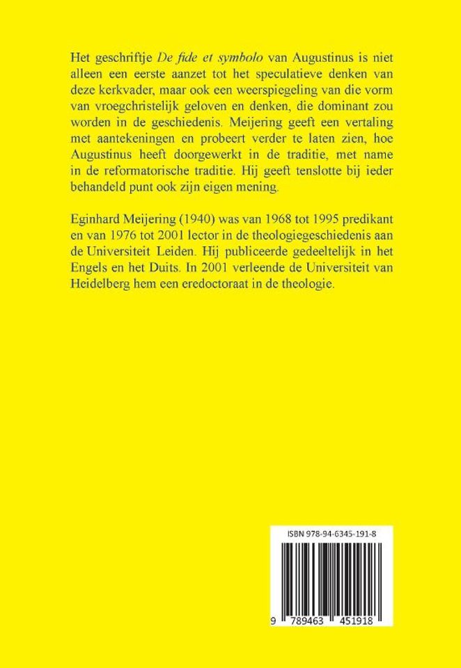 Het geschriftje De fide et symbolo van Augustinus is niet alleen een eerste aanzet tot het speculatieve denken van deze kerkvader, maar ook een weerspiegeling van die vorm van vroegchristelijk geloven en denken, die dominant zou worden in de geschiedenis. Meijering geeft een vertaling met aantekeningen en probeert verder te laten zien, hoe Augustinus heeft doorgewerkt in de traditie, met name in de reformatorische traditie. Hij geeft tenslotte bij ieder behandeld punt ook zijn eigen mening.
