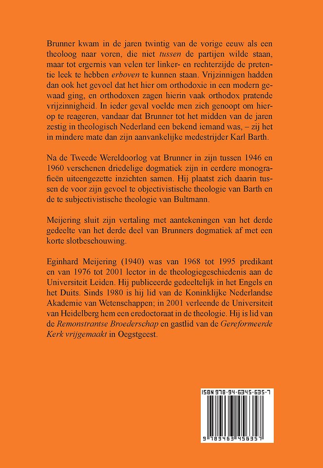 Na de Tweede Wereldoorlog vat Brunner in zijn tussen 1946 en 1960 verschenen driedelige dogmatiek zijn in eerdere monogra-fieën uiteengezette inzichten samen. Hij plaatst zich daarin tus-sen de voor zijn gevoel te objectivistische theologie van Barth en de te subjectivistische theologie van Bultmann.