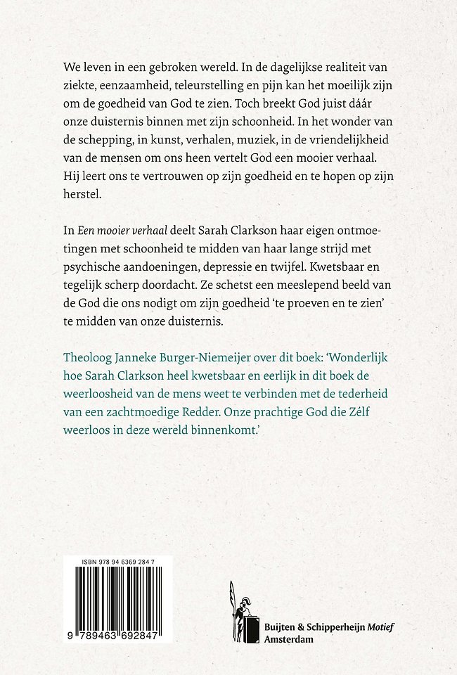 In Een mooier verhaal deelt Sarah Clarkson haar eigen ontmoetingen met schoonheid te midden van haar lange strijd met psychische aandoeningen, depressie en twijfel. Kwetsbaar en tegelijk scherp doordacht. Ze schetst een meeslepend beeld van de God die ons nodigt om zijn goedheid ‘te proeven en te zien’ te midden van onze duisternis.