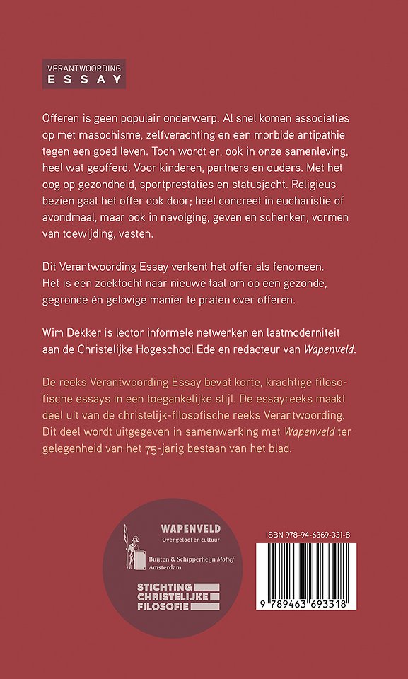 De reeks Verantwoording Essay bevat korte, krachtige filosofische essays in een toegankelijke stijl. De auteurs prikkelen en zetten aan tot nadenken. Zij schuwen een duidelijke stellingname niet. De essayreeks maakt deel uit van de christelijk-filosofische reeks Verantwoording.