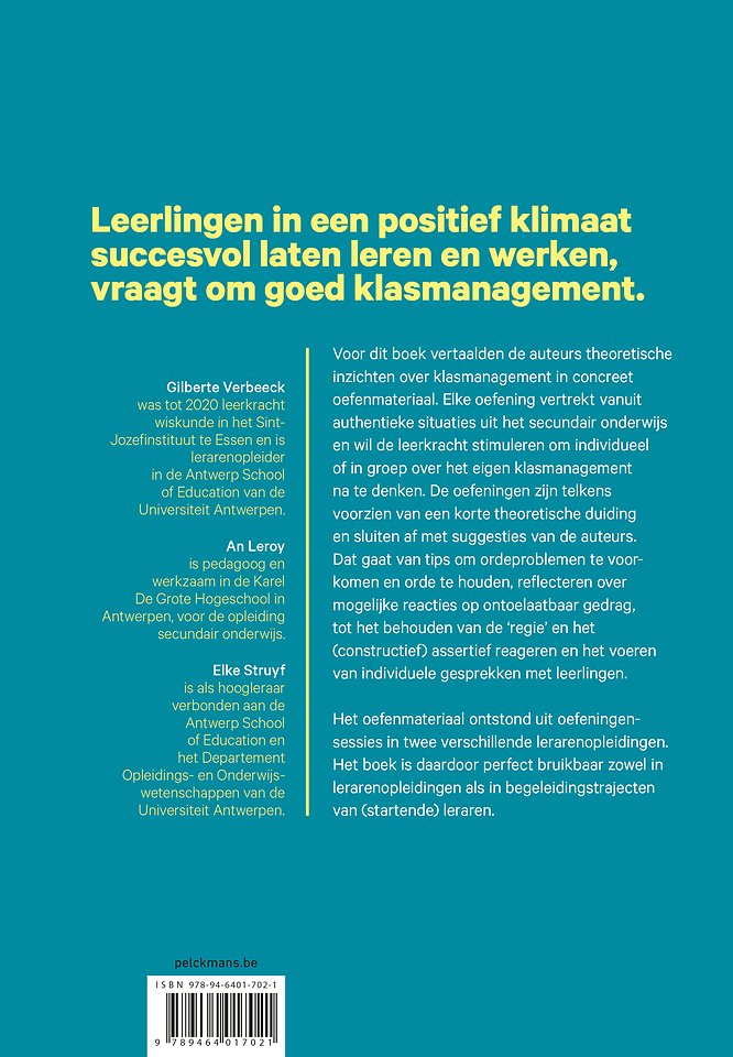 Voor dit boek vertaalden de auteurs theoretische inzichten over klasmanagement in concreet oefenmateriaal. Elke oefening vertrekt vanuit authentieke situaties uit het secundair onderwijs en wil de leerkracht stimuleren om individueel of in groep over het eigen klasmanagement na te denken. De oefeningen zijn telkens voorzien van een korte theoretische duiding en sluiten af met suggesties van de auteurs.