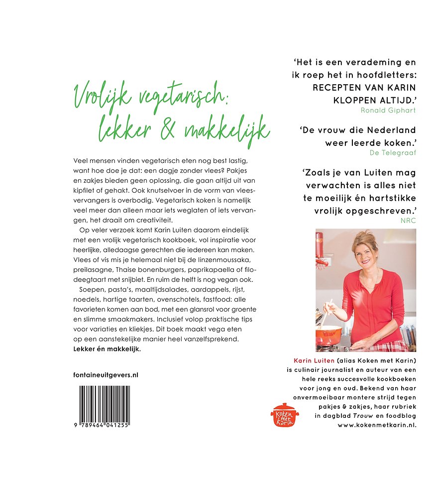 Veel mensen vinden vegetarisch eten nog best lastig, want hoe doe je dat: een dagje zonder vlees? Pakjes en zakjes bieden geen oplossing, die gaan steevast uit van kipfilet of gehakt. Vegetarisch koken is echter veel meer dan alleen maar 'iets weglaten', het draait om creativiteit. Op veler verzoek komt Karin Luiten daarom eindelijk met een vrolijk vegetarisch kookboek, vol inspiratie voor heerlijke, alledaagse gerechten die iedereen kan maken. Vlees of vis mis je helemaal niet bij de linzenmoussaka, preilasagne, Thaise bonenburgers, paprikapaella of filodeegtaart met snijbiet.