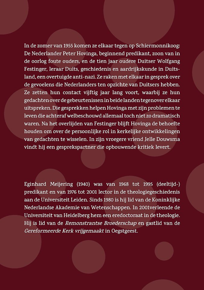 uitspreken. Die gesprekken helpen Hovinga met zijn problemen te leven die achteraf welbeschouwd allemaal toch niet zo dramatisch waren. Na het overlijden van Festinger blijft Hovinga de behoefte houden om over de persoonlijke rol in kerkelijke ontwikkelingen van gedachten te wisselen. In zijn vroegere vriend Jelle Douwsma vindt hij een gesprekspartner die opbouwende kritiek levert.