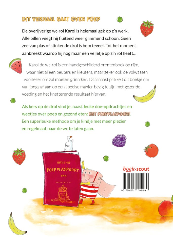 Karol de wc-rol is een handgeschilderd prentenboek op rijm waar niet alleen peuters en kleuters, maar zeker ook de volwassen voorlezer om zal moeten grinniken. Daarnaast prikkelt dit boekje om van jongs af aan op een speelse manier bezig te zijn met gezonde voeding en het knetterende resultaat hiervan. Als kers op de drol vind je, naast leuke doe-opdrachtjes en weetjes over gezond eten en poep: het PoepPlaspoort. Een superleuke methode om je kindje met meer plezier en regelmaat naar het toilet te laten gaan.