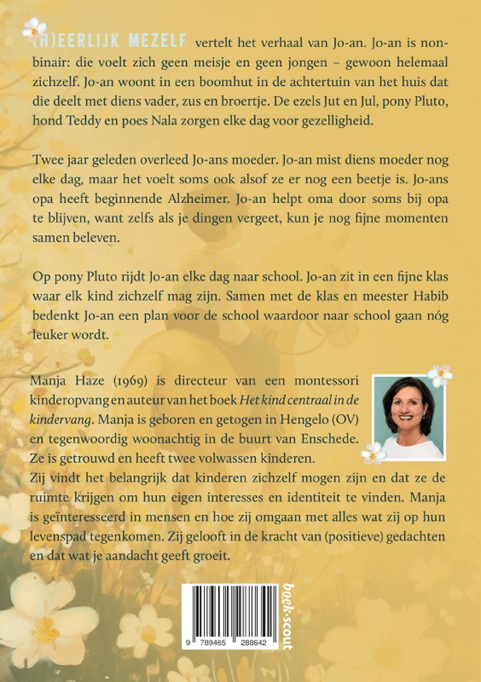 (H)eerlijk mezelf vertelt het verhaal van Jo-an. Jo-an is non-binair: die voelt zich geen meisje en geen jongen – gewoon helemaal zichzelf. Jo-an woont in een boomhut in de achtertuin van het huis dat die deelt met diens vader, zus en broertje. De ezels Jut en Jul, pony Pluto, hond Teddy en poes Nala zorgen elke dag voor gezelligheid.